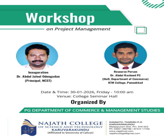 PG Dept. of Commerce & Management Studies, Najath College of Science & Technology, Karuvarakundu, invites you to a hands-on workshop designed to enhance your understanding of project planning and execution.